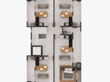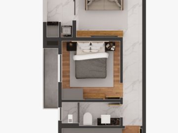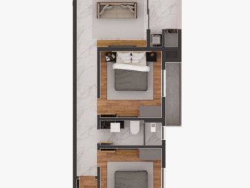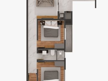Unidades com área privativa de 58,21m² a 58,69m², com 1 suíte e 1 quarto, living room e sala de jantar, garantindo ótima ventilação e iluminação natural.
